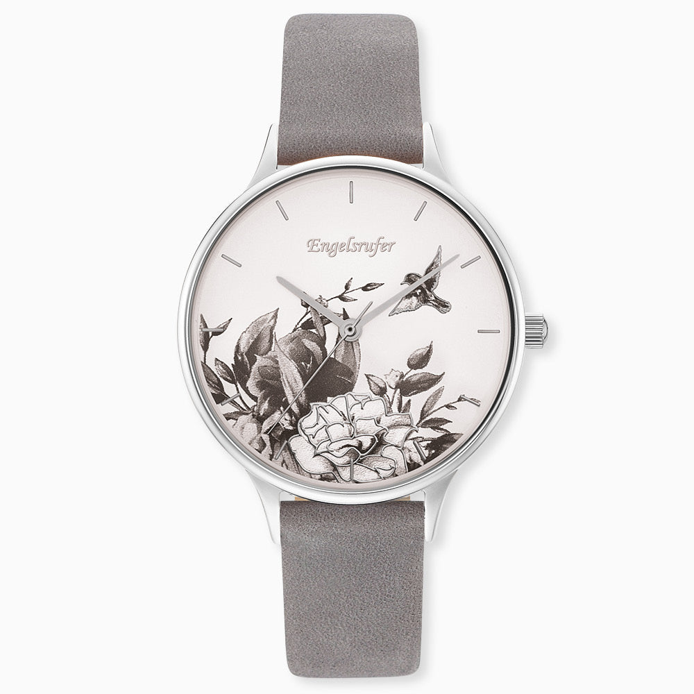 Uhr Edelstahl Blume Silber mit Nubuk Lederband Grau