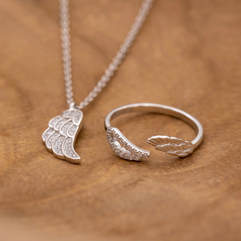 Dein persönlicher Glücksbringer - dieser größenverstellbare Engelsflügel Ring überzeugt durch die Vielzahl an kleinen Details und ist ideal mit weiteren Schmuckstücken kombinierbar. Der beschützende Flügel hüllt Dich in unendliche Geborgenheit. Ein besonderes Highlight sind die edel schimmernden synthetischen Zirkonia Steine. Denn was könnte femininer sein als strahlend schöne Kristalle umgeben von klassischem Silber.