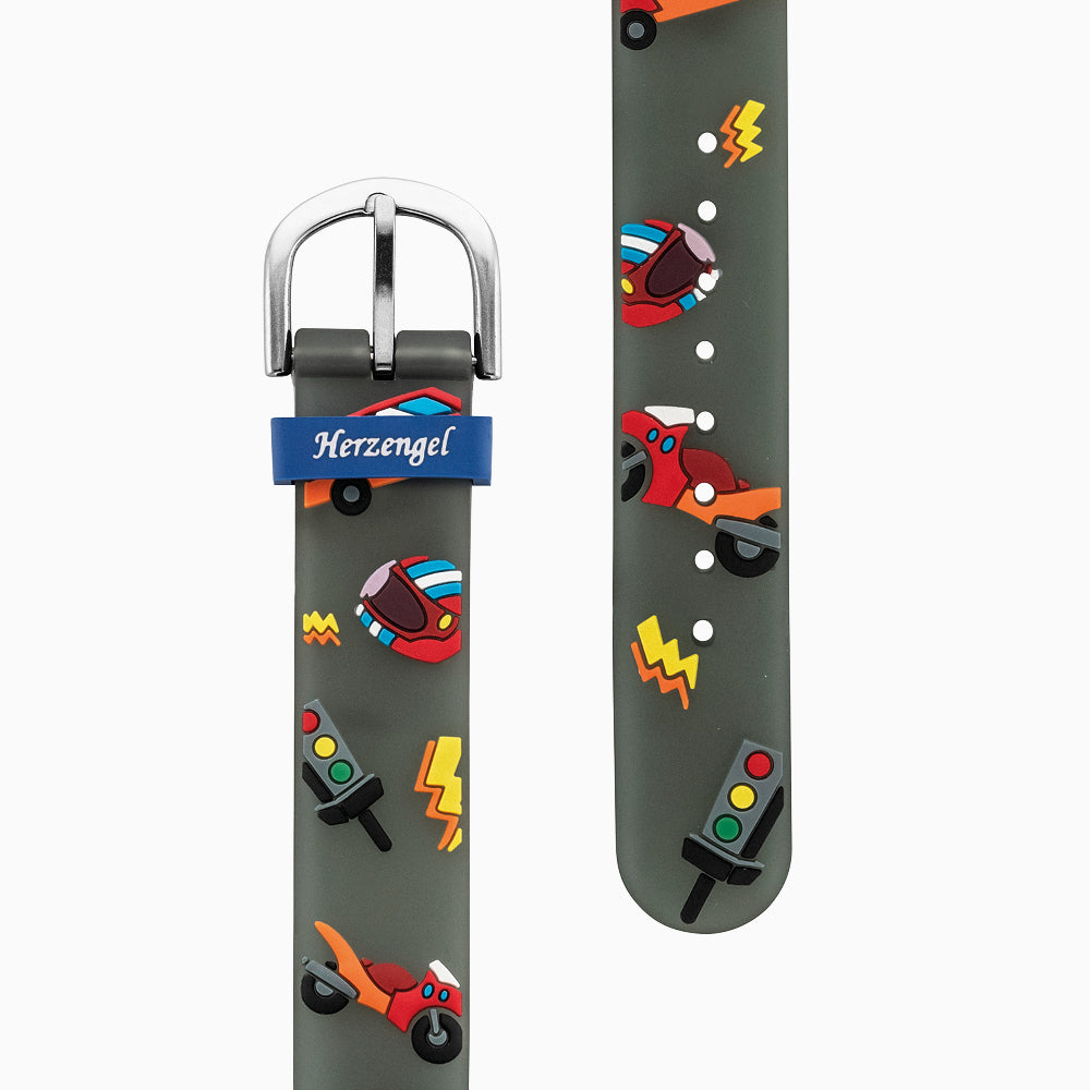 Herzengel’s Rennfahrer – jederzeit bereit für ein Abenteuer auf der Rennbahn, bei dem es rasend schnell zugeht. Diese farbenfrohe Armbanduhr mit vielen Motiven rund um das Thema Rennen lässt Jungenherzen höher schlagen.