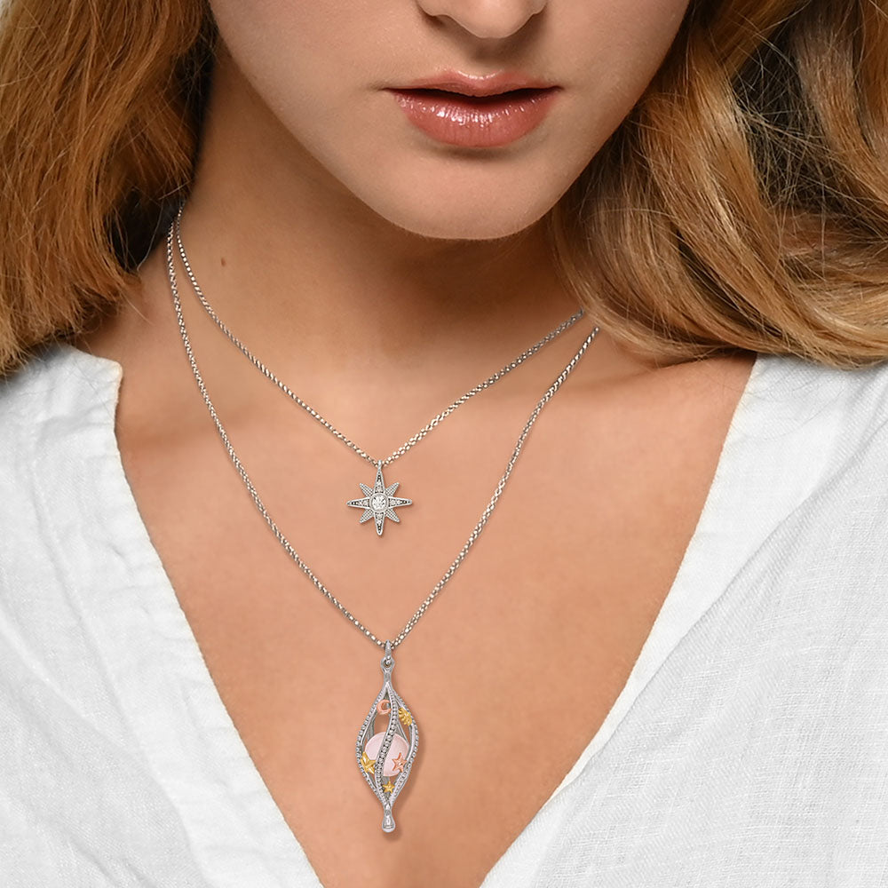 Your are my Universe - unsere wunderschöne Engelsrufer Kette aus hochwertigen 925er Sterlingsilber mit einem bezaubernden Anhänger symbolisiert das Universum. Er umhüllt einen Rosenquarz als Planet der Liebe und Harmonie. Als Zeichen der unzähligen kleinen und großen Objekte im Weltall schweben Sonne, Mond und Sterne als kleine liebevolle Details in Gold und Rosé um den silbernen Körper. Das ausdrucksstarke Tricolor besticht in zart schimmernden Pastelltönen und wirkt besonders sanft.