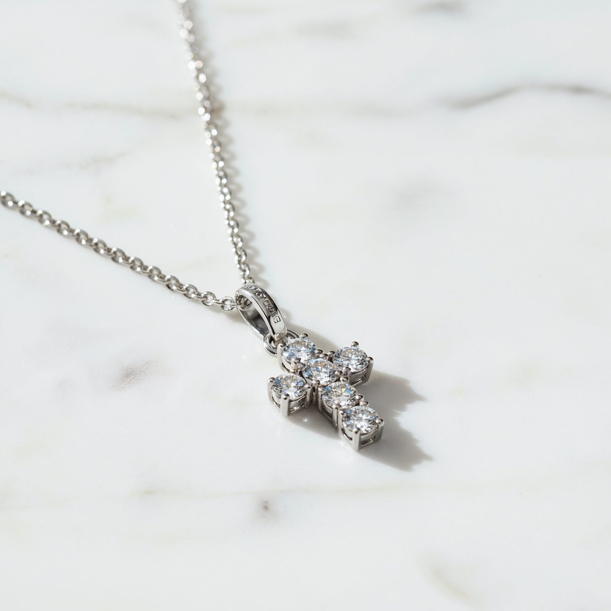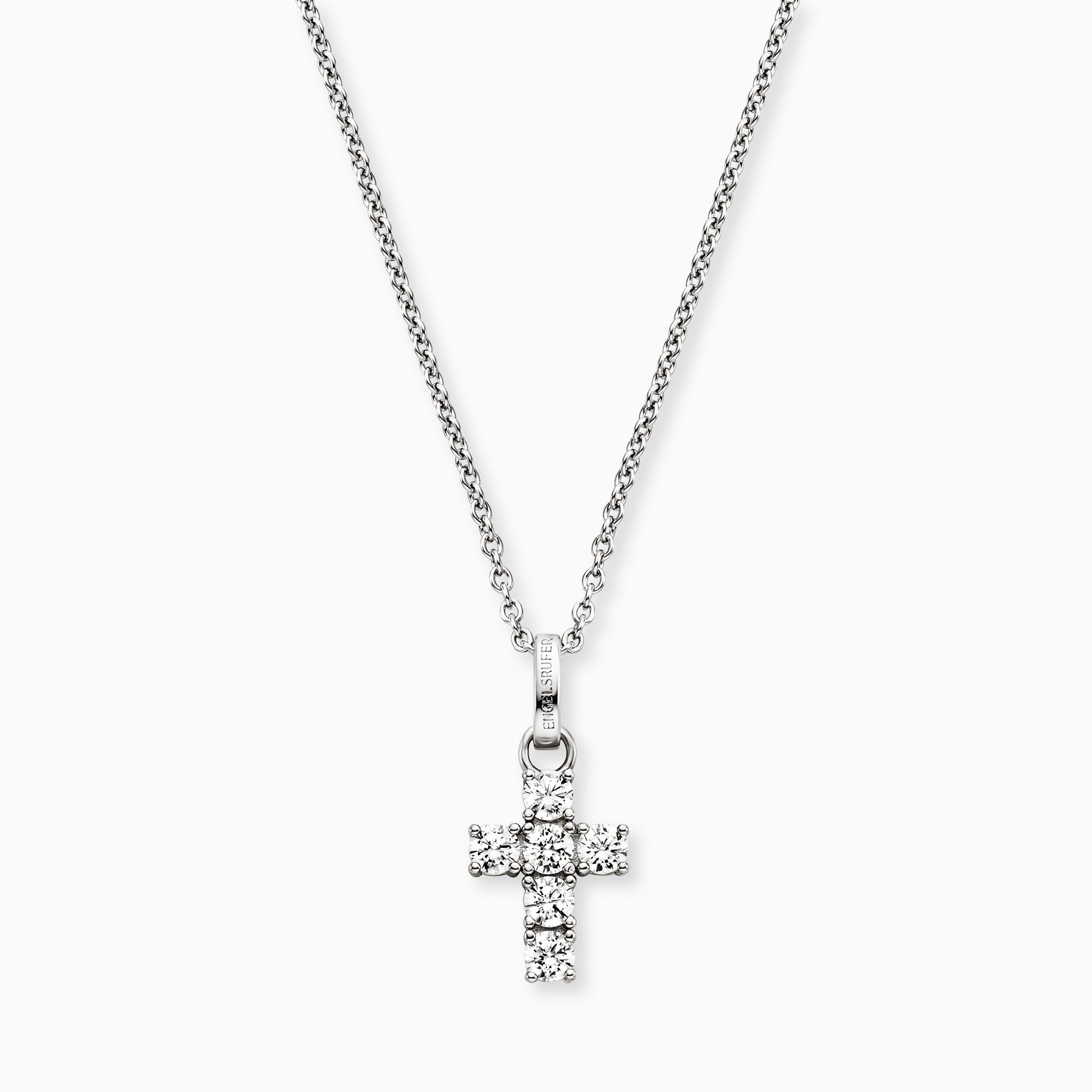 Dein Schutzengel für die Ewigkeit - diese Kette mit Anhänger in Kreuzform bietet die optimale Grundlage für individuelle Gestaltungsmöglichkeiten. Das Kreuz verbreitet Reinheit und bezaubert mit seiner positiven Wirkung. Das Schmuckstück überzeugt dabei durch die Vielzahl an kleinen Details und ist ideal mit weiteren Schmuckstücken kombinierbar. Ein besonderes Highlight sind die edel schimmernden synthetischen Zirkonia Steine. Denn was könnte femininer sein als strahlend schöne Kristalle umgeben von klassischem Silber. Das zeitlose Schmuckstück wird mit einem Karabinerhaken verschlossen und ist in drei Längen verstellbar.