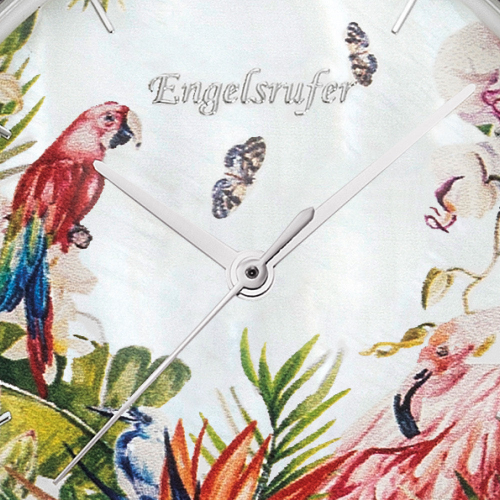 Paradise – eine paradiesische Farbvielfalt bringt einen Hauch Natur zu Dir nach Hause. Diese zeitlose Kombination verzaubert mit einem flachen Gehäuse, 3-Zeiger-Werk sowie zwei Wechselbändern in einem Set. Ein hochwertiges Band aus echtem italienischem Nubukleder mit mindestens 16 cm und maximal 21 cm Umfang, sowie ein feingliedriges längenverstellbares Mesh-Uhrenband individuell bis maximal 21,5 cm Umfang einstellbar. Die feinen natürlichen und farbenfrohen Akzente des Zifferblattes auf zartglänzendem Perlmutt machen diese Uhr zu einem stilvollen Evergreen. Das besondere Highlight ist unser buntes Blütenparadies mit Papagei.